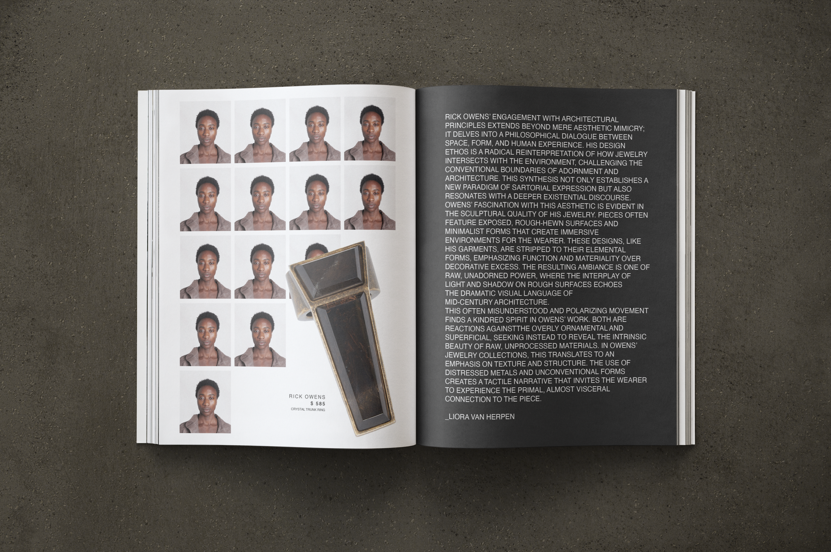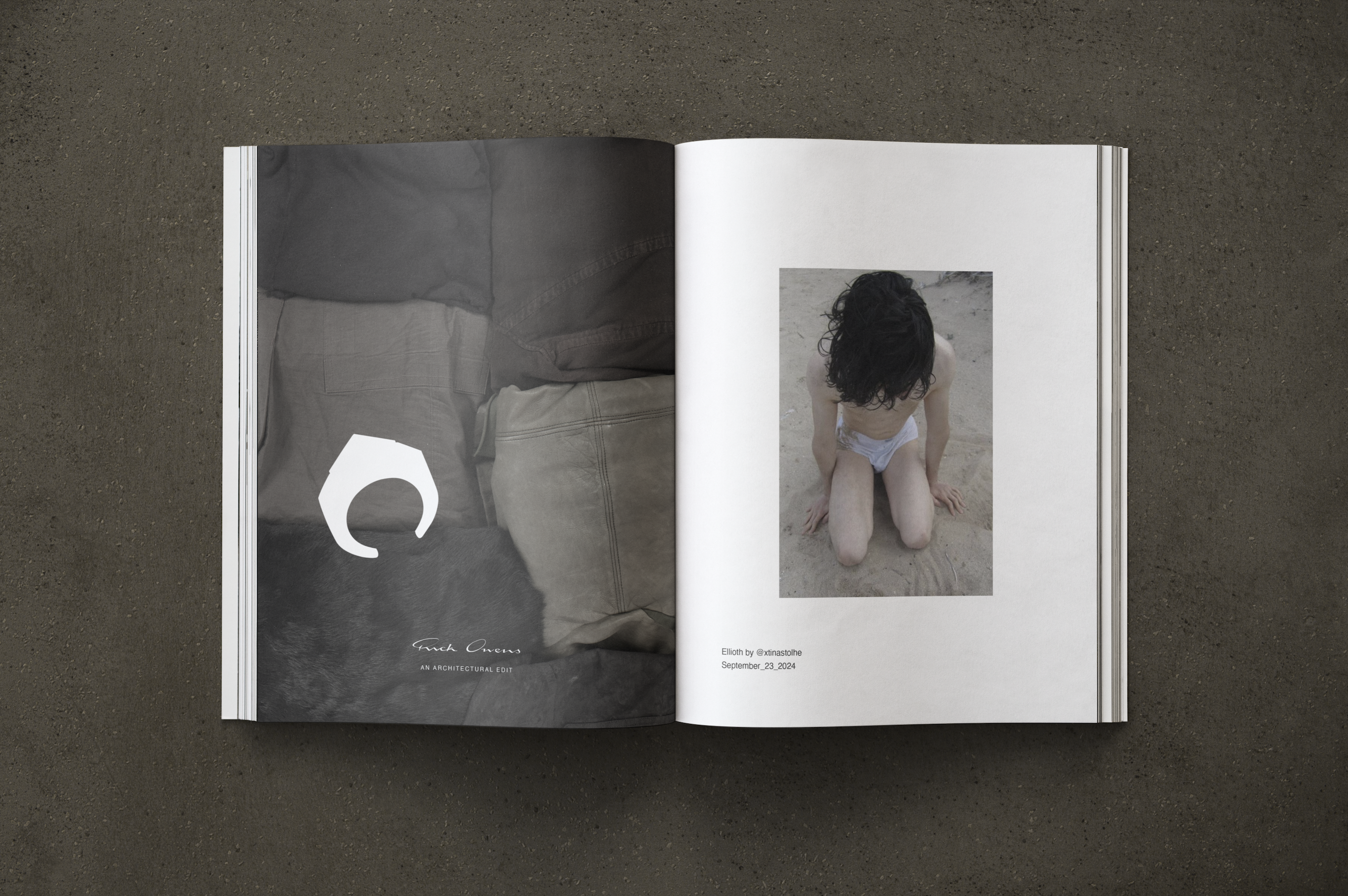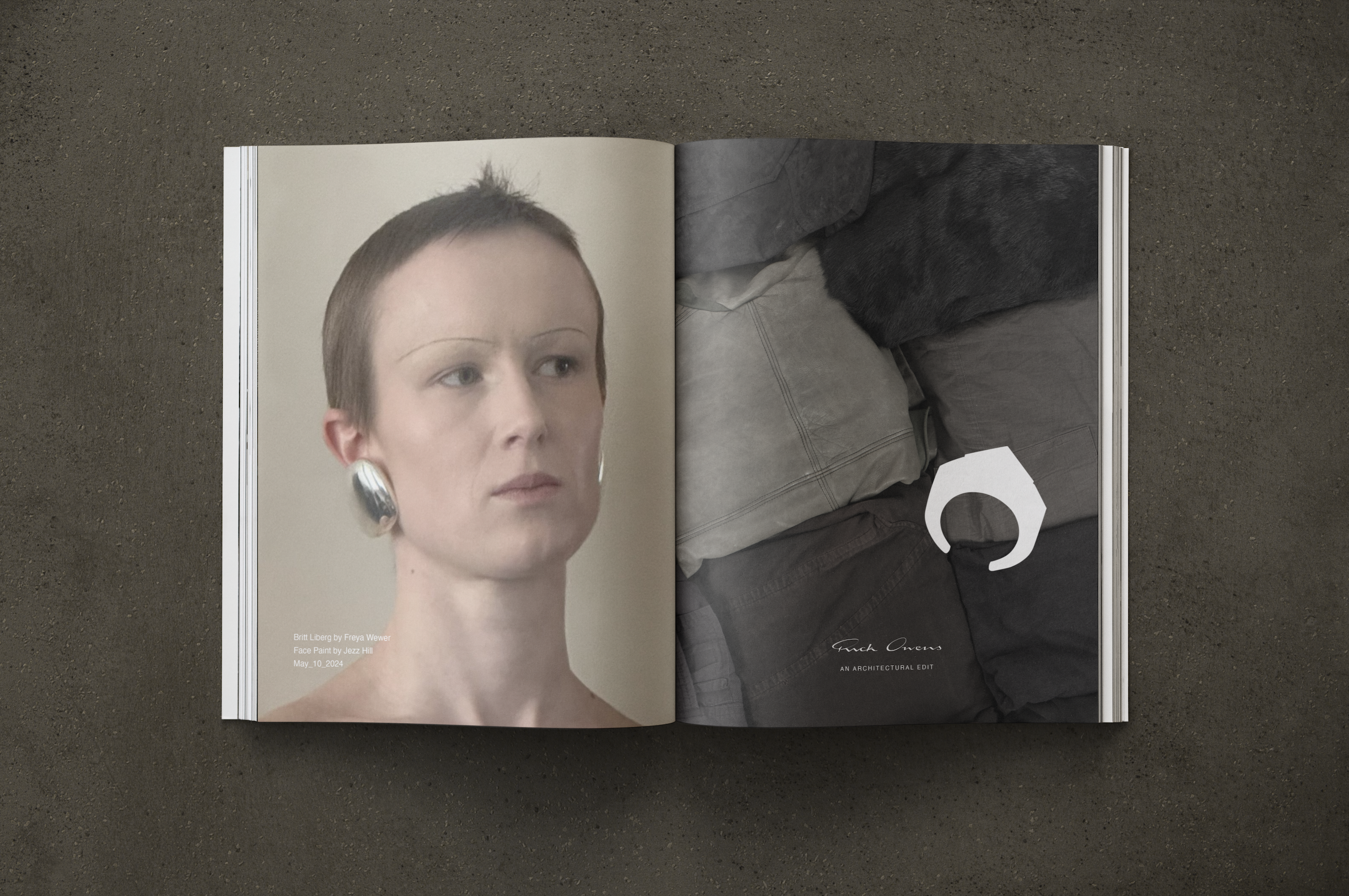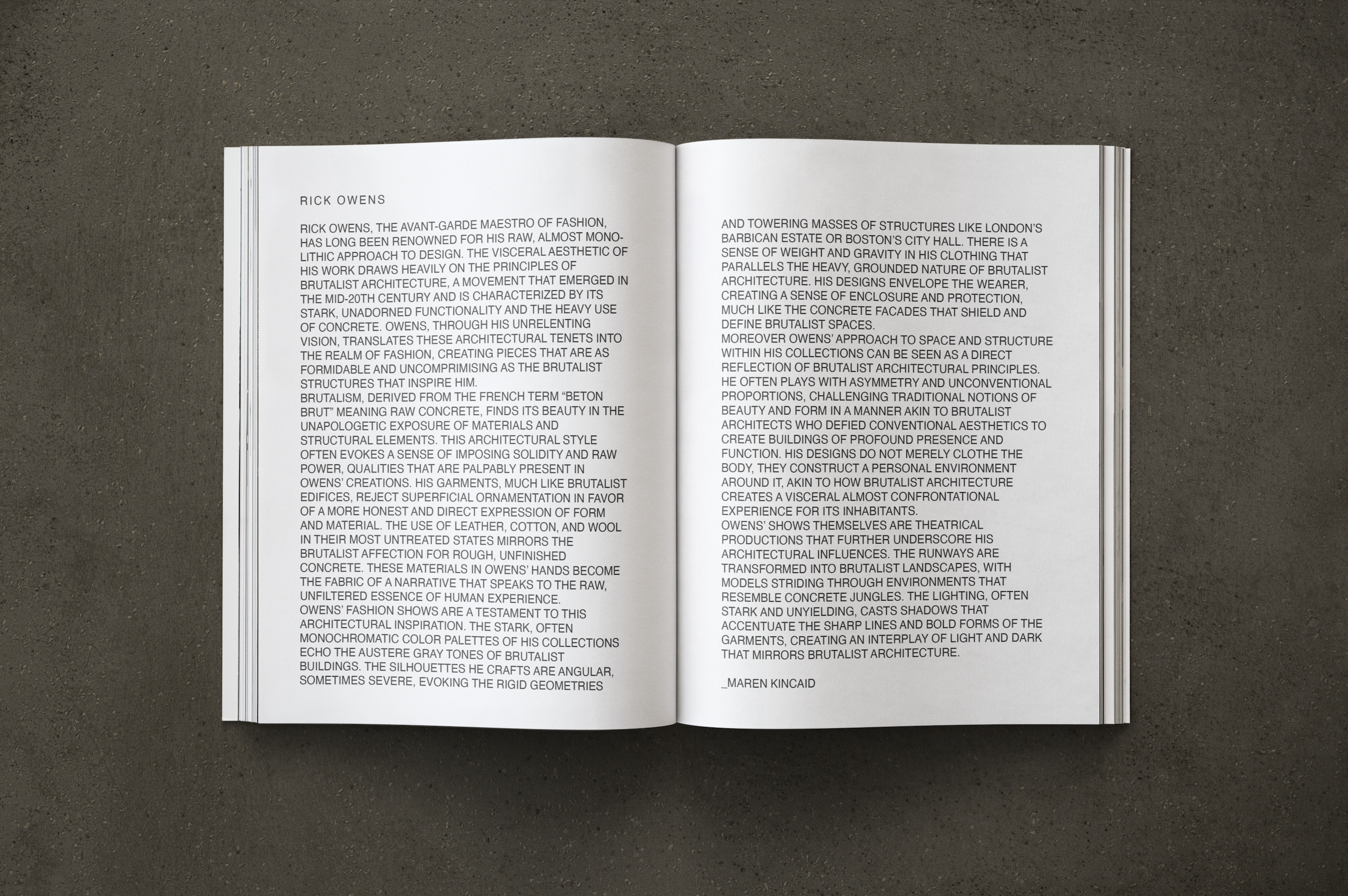 - In this piece, you will find an editorial catalogue designed to both sell, and inform on behalf of Rick Owens. Made to be featured in Issue Issue Magazine out of Copenhagen, this spread discusses the influence brutalist architecture has on Owens’ designs. The images below are the result of my creative direction and design process.